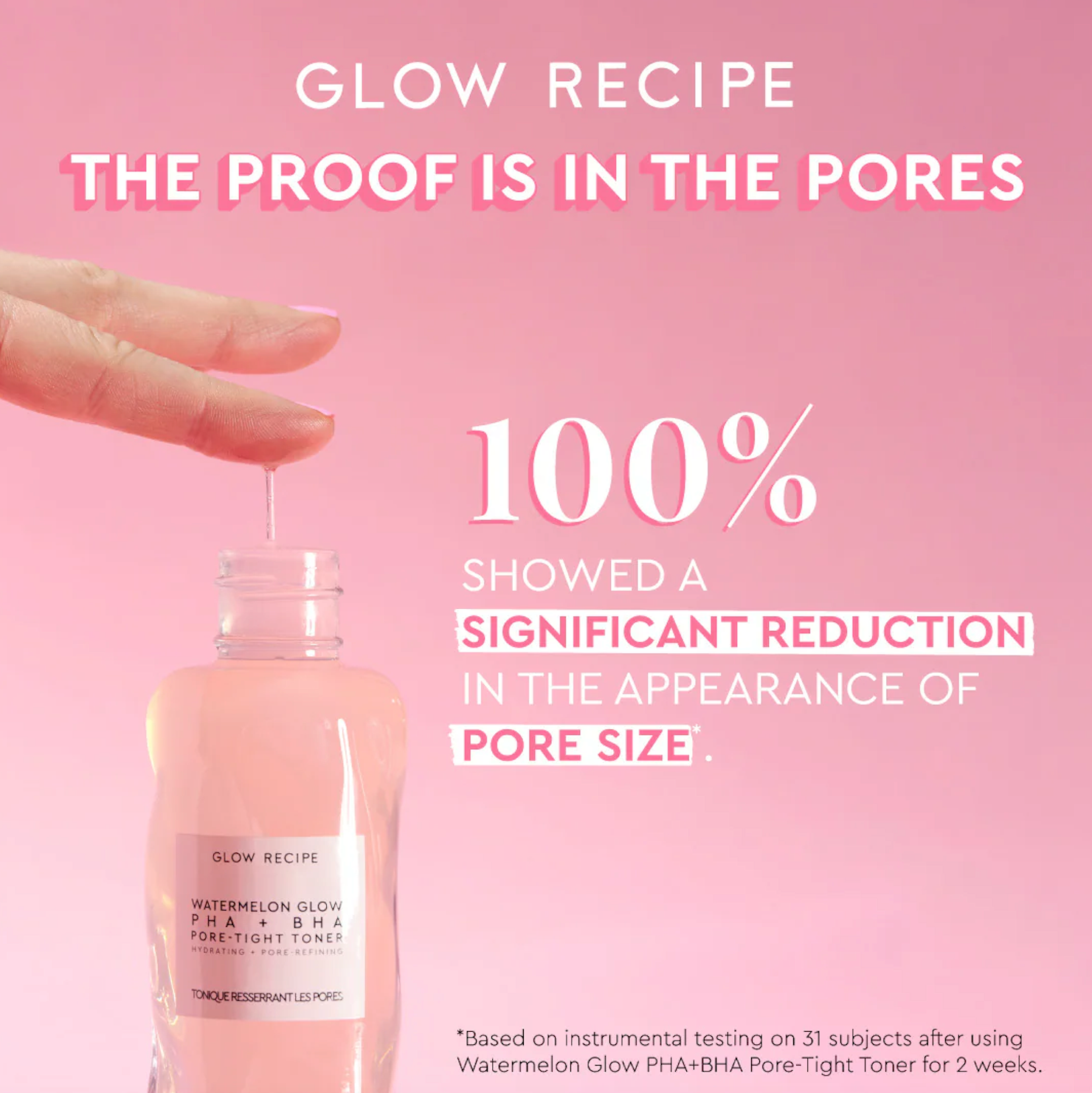 Glow Recipe ウォーターメロン グロウ ポア タイト トナーは、保湿と角質ケアを兼ね備えたトナーで、肌を整え、リフレッシュします。ジューシーなウォーターメロンエキスが潤いを与え、PHAとBHAがやさしく角質を取り除き、なめらかで輝く肌へと導きます。毛穴の目立ちを抑え、肌のテクスチャーを整えながら、柔らかくしっとりとした仕上がりに。敏感肌を含むすべての肌タイプに適しており、透明感のある輝く肌を手に入れるための必須アイテムです。