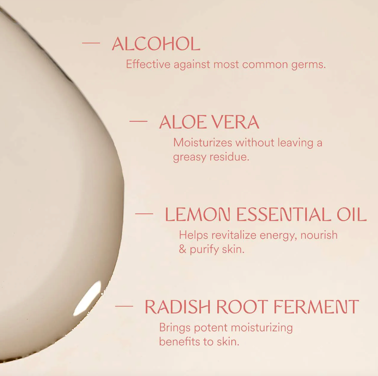 Alcohol, Water, Aloe Barbadensis Leaf Juice, Leuconostoc/Radish Root Ferment Lysate Filitrate, Glycereth-26, Citrus Limon (Lemon) Peel Oil, Citrus Aurantifolia (Lime) Oil, Fragrance, Hexyl Cinnamal, Geraniol, Alpha-Isomethyl Ionone, Linalool.